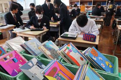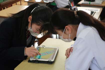 「シンボルネームの配色を決めよう」をテーマに、タブレットを活用して作品づくりに没頭していました。