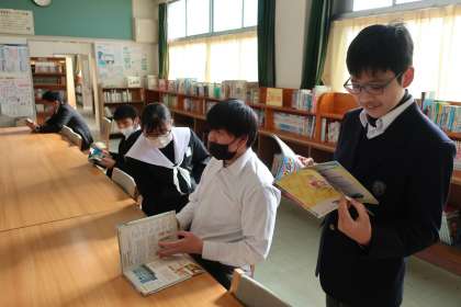 今回は、図書室での学習です。前半は、名古屋市科学館への校外学習に向けての調べ学習、後半は、各自が興味をもった本を仲間に紹介していました。