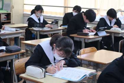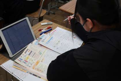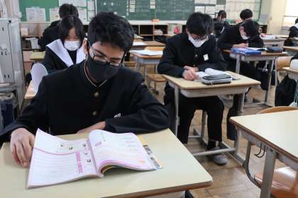 中学校で学習した地理・歴史・公民の各分野の総復習に取り組んでいました。