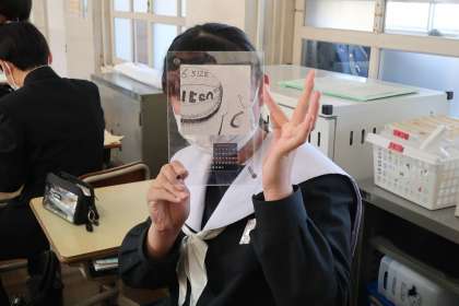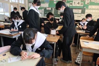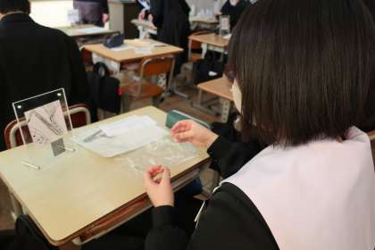 中学校での印象的な場面をイラストにし、点描で仕上げた作品を万年カレンダーにはめ込んでいきます。中学校で作る最後の作品もいよいよ完成です。