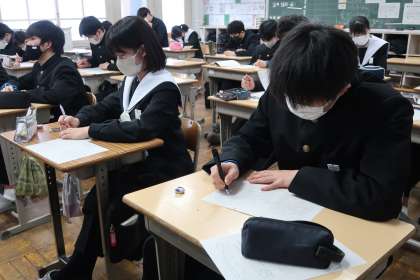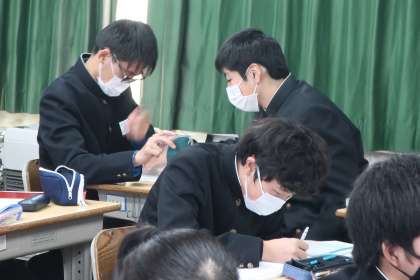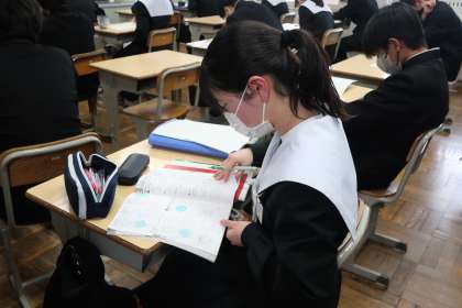 明後日に実施される義務教育最後の「確認テスト」に向け、図形問題や文章問題など正確に早く正解を導き出せるよう、たくさんの問題にあたっていました。