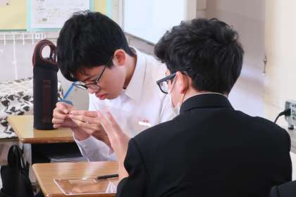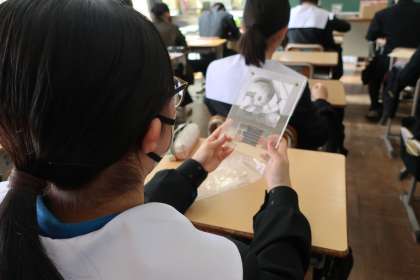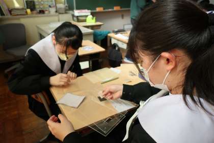 中学校での印象的な場面をイラストにし、点描で仕上げた作品を万年カレンダーにはめ込んでいきます。中学校で作る最後の作品もいよいよ完成です。