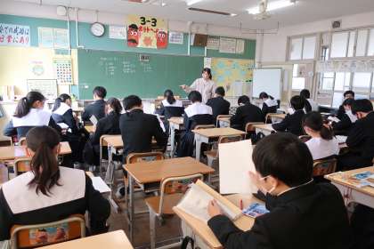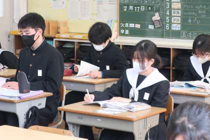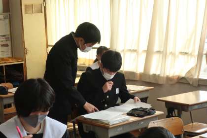 先週末に取り組んだ確認テストが返却され、仲間同士で考え方や答えの導き出し方について確認していました。