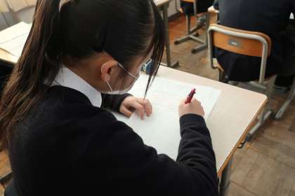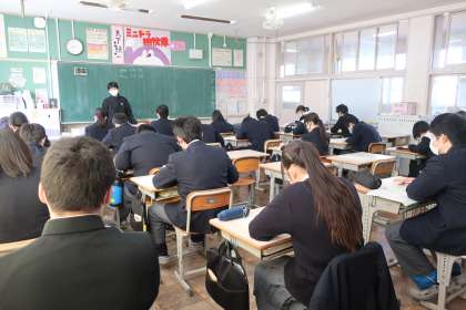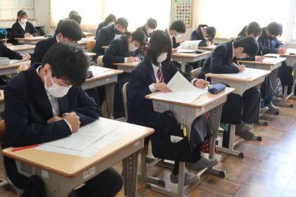 定期テストが返却され、解説が行われていました。解答用紙を見つめながら、解き直しに取り組んでいました。