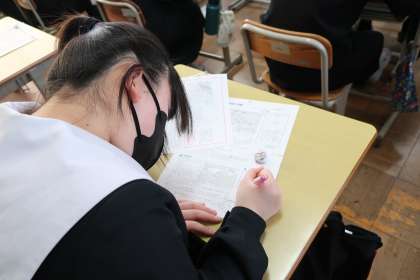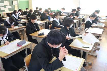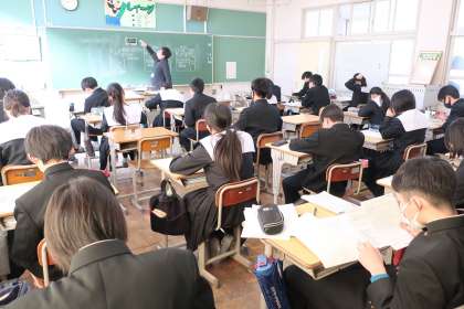 返却された確認テストを使って、入試に必要な考え方と卒業後の社会の学習について解説がされていました。