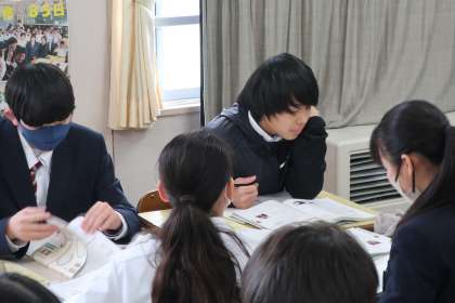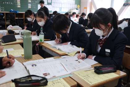 2/18 1-2 図形問題を極める 2 公開日 2025/02/18 更新日 2025/02/18 各学年から 1年2組の数学の授業の様子です。 定期テストの解説のあと、図形問題の理解を深めるため、教科書の問題にチャレンジしていました。