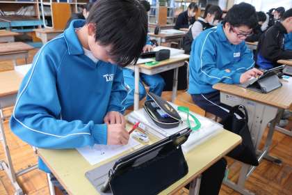 「シンボルネームの配色を決めよう」をテーマに、タブレットを活用して作品づくりに没頭していました。