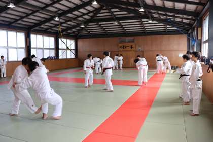 地稽古では、積極的に顧問やコーチと組んでいました。また、練習に参加していた3年生が丁寧にアドバイスを与えている姿が印象的でした。