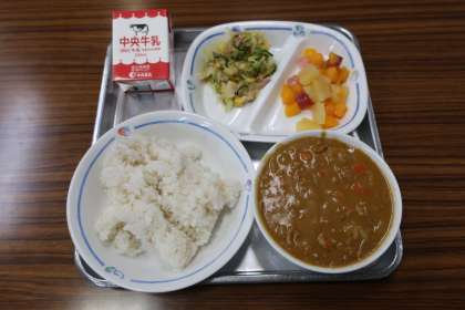 3/4 今日の給食 公開日 2025/03/04 更新日 2025/03/04 特別活動 今日の献立は ————— カレーライス(麦ごはん)、ツナサラダ、ゼリーミックス、牛乳 でした。 *エネルギー:917kcal たんぱく質:28.1g