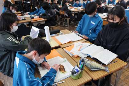 2/25 1-1 変化の様子を図で表現 2 公開日 2025/02/25 更新日 2025/02/25 各学年から 1年1組の国語の授業の様子です。 「少年の日の思い出」の学習で、「登場人物の行動と心情の変化を読み取ろう」のテーマに迫るため、図を用いて変化の様子を表現していました。
