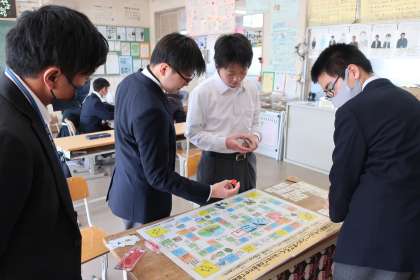 これまでに学習してきた防災関連の内容も発表会を終え、その知識をさらに高めていこうと、すごろくやカードゲームに取り組んでいました。