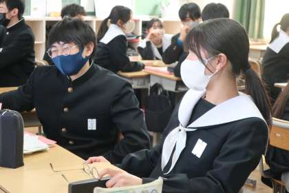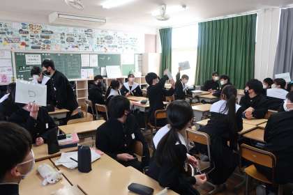 義務教育最後の授業です。グループ対抗で入試にも役立つ国語クイズにチャレンジしていました。明日の入試本番でも、このリラックスした雰囲気で最高の力を発揮してほしいと思います。