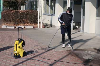 一方、ひと足先に進学先を決めた生徒たちは登校して、奉仕活動に取り組みました。各自の教室のワックスがけ、学年フロアの整備、昇降口前の洗浄など、限られた人数でもしっかりと活動することができました。
