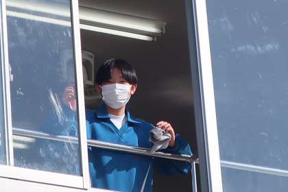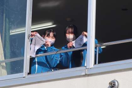一方、ひと足先に進学先を決めた生徒たちは登校して、奉仕活動に取り組みました。各自の教室のワックスがけ、学年フロアの整備、昇降口前の洗浄など、限られた人数でもしっかりと活動することができました。