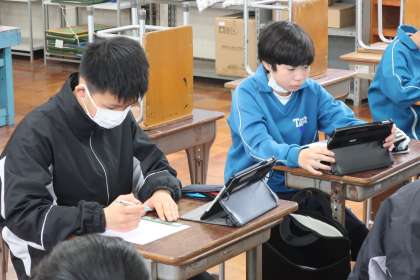 「シンボルネームの配色を決めよう」をテーマに、タブレットを活用して作品づくりに没頭していました。