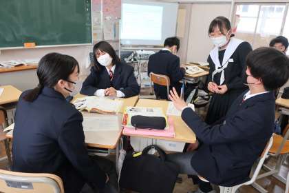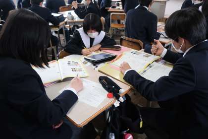 ALTに我が町の有名な場所の紹介をするため、仲間と意見を出し合いながらレポートをまとめていました。