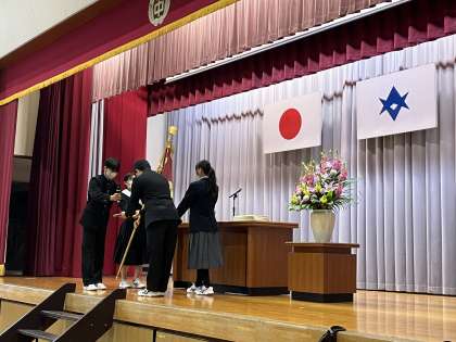 始めて行う卒業式全校練習を前に、本校で受け継がれる太鼓のばちと校旗の引継ぎ式です。3年生が後輩たちに想いを託しています。