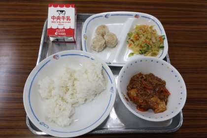 家常豆腐(ジャーチャンドウフ)、中華あえ、えびしゅうまい、ごはん、牛乳 でした。