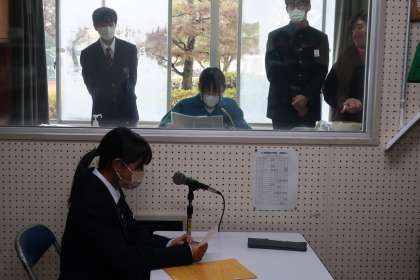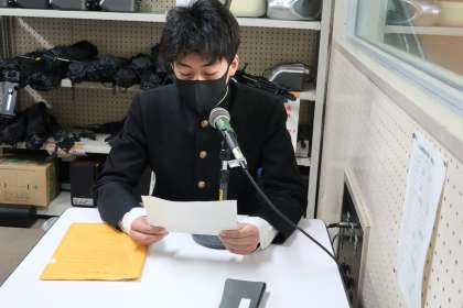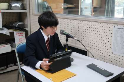 写真は、給食時の放送で立候補者の応援演説をする責任者の生徒たちです。