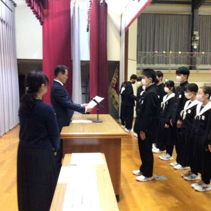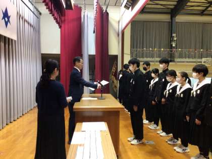 本日の卒業式予行練習(全校練習)の時に行われた『高中賞』授与の様子です。