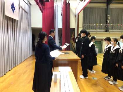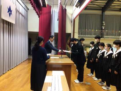 本日の卒業式予行練習(全校練習)の時に行われた『高中賞』授与の様子です。