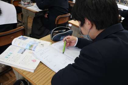 雨が降る仕組みの学習を進めるため、今回は「雲のでき方」について学んでいました。今日の天気もちょうど雨。イメージしやすい環境の中での学習です。