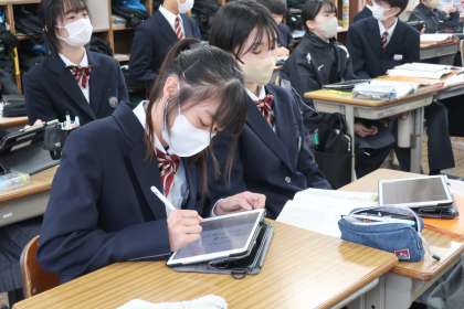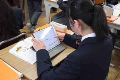 「漢字の成り立ち」の学習で、4つの分類(象形・指事・会意・形声)に当てはまる漢字を仲間に紹介し合っていました。