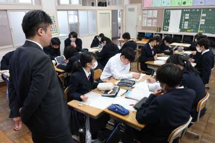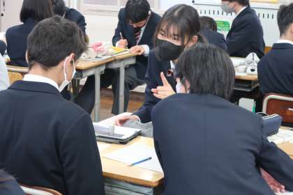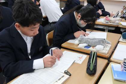 度数分布の学習で、データを集めて数学的に分析していきます。どの大きさが適しているかを調べるため、実際に紙吹雪を何度も落として集めた滞空時間のデータの集計に取り組んでいました。