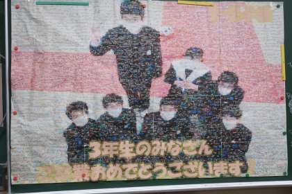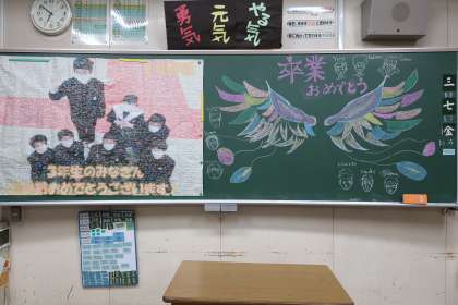 「第78回 卒業式」の様子をお届けします。——— 1,2学級教室の黒板メッセージです。