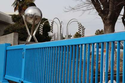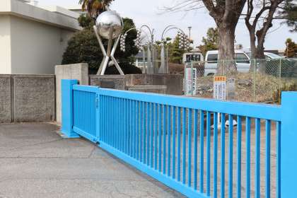 全校生徒が毎日の登下校で利用する東門:通称「青門」。本校のジャージと同じ色の門です。