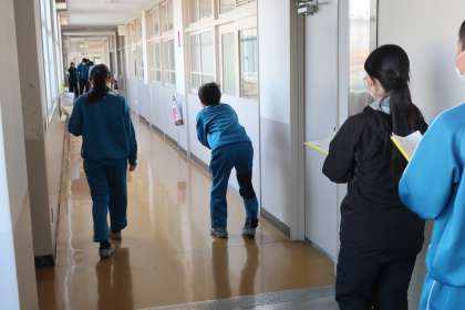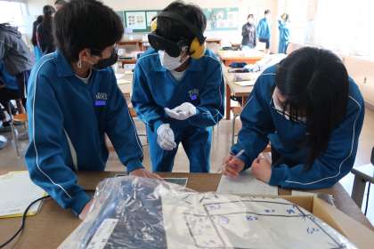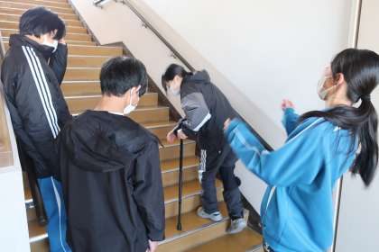 「高齢者との関わり」を学ぶため、高齢者体験に挑戦しました。視野を狭くしたり、ひざやひじを曲げにくくするサポーターをつけた体験を通して、当事者の苦労や大変さ、周りがどんなサポートをするとよいかなどを考えていました。