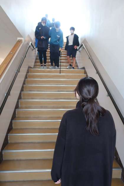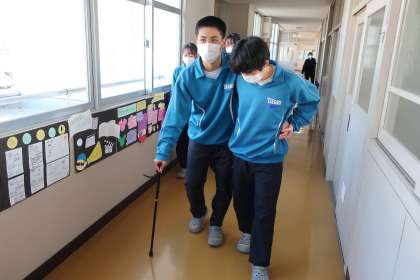 「高齢者との関わり」を学ぶため、高齢者体験に挑戦しました。視野を狭くしたり、ひざやひじを曲げにくくするサポーターをつけた体験を通して、当事者の苦労や大変さ、周りがどんなサポートをするとよいかなどを考えていました。