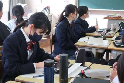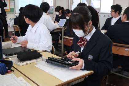 度数分布の学習で、データを集めて数学的に分析していきます。どの大きさが適しているかを調べるため、実際に紙吹雪を何度も落として集めた滞空時間のデータの集計に取り組んでいました。