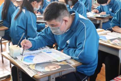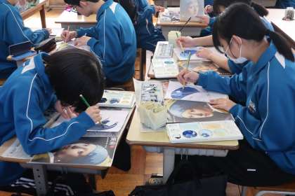 教科書の表紙に掲載されているフェルメールの「真珠の耳飾りの少女」を題材に、カラーデッサン(色の塗り方を覚える練習)に取り組んでいました。