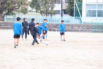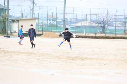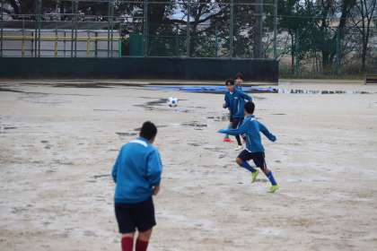 雨の中、グラウンドの状態が悪くても、一生懸命練習していました。様々な攻めのパターンからシュートを狙う練習に取り組んでいました。