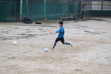 雨の中、グラウンドの状態が悪くても、一生懸命練習していました。様々な攻めのパターンからシュートを狙う練習に取り組んでいました。