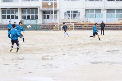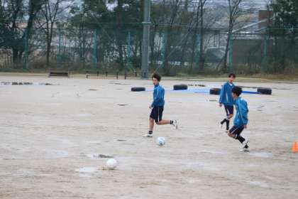 雨の中、グラウンドの状態が悪くても、一生懸命練習していました。様々な攻めのパターンからシュートを狙う練習に取り組んでいました。