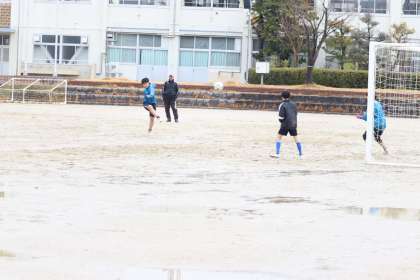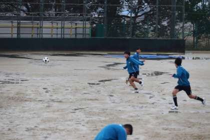 雨の中、グラウンドの状態が悪くても、一生懸命練習していました。様々な攻めのパターンからシュートを狙う練習に取り組んでいました。