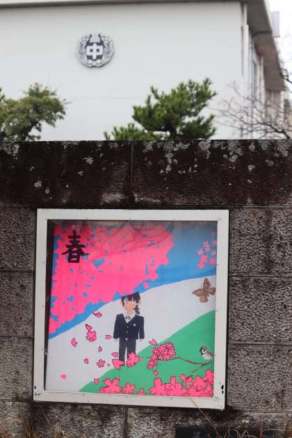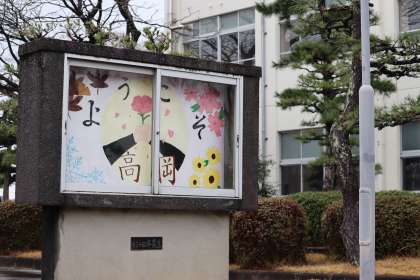 美術部の生徒たちが季節ごとにイラストを変えてくれている校内の掲示板。上の写真は、正門を入って右手にある掲示板です。春用のイラストにリニューアルされていました。