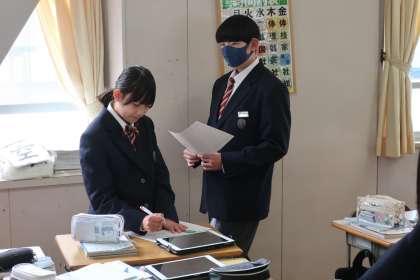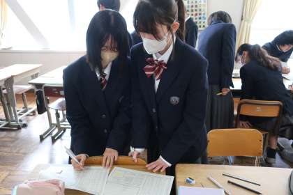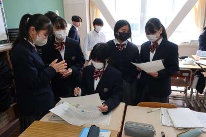 度数分布の学習で、実際に紙吹雪を何度も落として集めた滞空時間のデータ集計を終え、導き出した法則を仲間に説明し合っていました。