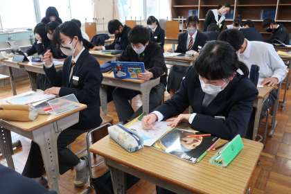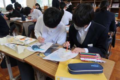 教科書の表紙に掲載されているフェルメールの「真珠の耳飾りの少女」を題材に、カラーデッサン(色の塗り方を覚える練習)に取り組んでいました。