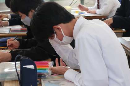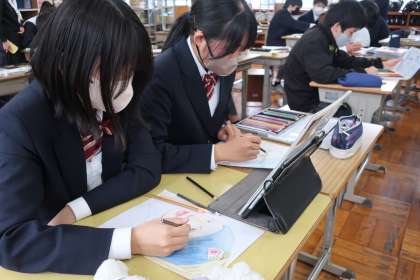 教科書の表紙に掲載されているフェルメールの「真珠の耳飾りの少女」を題材に、カラーデッサン(色の塗り方を覚える練習)に取り組んでいました。