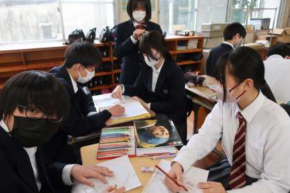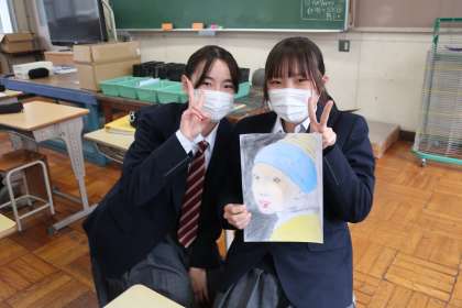 3/19 2-1 カラーデッサン 3 公開日 2025/03/19 更新日 2025/03/19 各学年から 2年1組の美術の授業の様子です。 教科書の表紙に掲載されているフェルメールの「真珠の耳飾りの少女」を題材に、カラーデッサン(色の塗り方を覚える練習)に取り組んでいました。