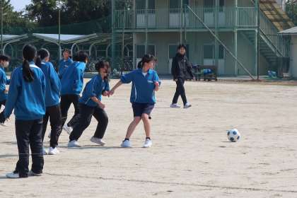 今年度最後の授業となったこの時間は、男女別にチームをつくり、サッカーのゲームに取り組んでいました。