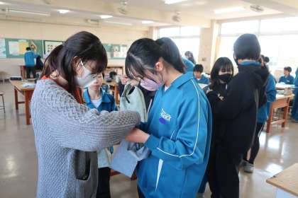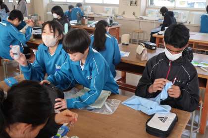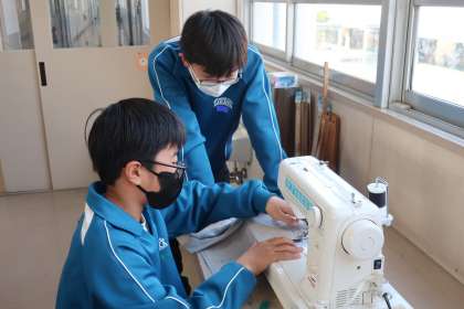 今年度最後の授業となったこの時間は、エコバックづくりの仕上げ、給食配膳台のカバーの補習やアイロンがけに取り組んでいました。助け合う姿は、この一年の成長の証です。