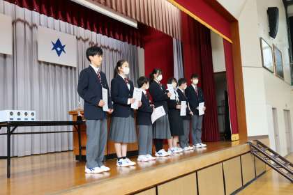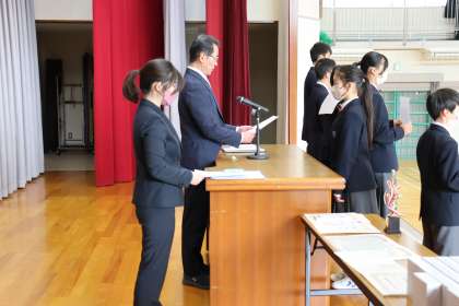 修了式前に行われた令和7年度前期生徒会役員の認証式の様子です。