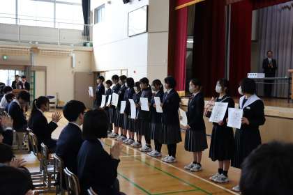 教育委員会表彰、部活動の大会結果、各種コンクールや作品応募、学校外での様々な活動など、優秀な成績を残した生徒たちが紹介されました。