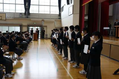 3/24 修了式 5 公開日 2025/03/24 更新日 2025/03/24 学校行事 修了式前に行われた表彰伝達の様子です。 教育委員会表彰、部活動の大会結果、各種コンクールや作品応募、学校外での様々な活動など、優秀な成績を残した生徒たちが紹介されました。