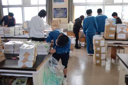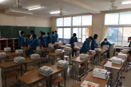入学式・始業式の会場となる体育館のセッティング、1年生教室の飾りつけ、各クラスへの教科書の配布など、それぞれの分担でしっかりと活動していました。