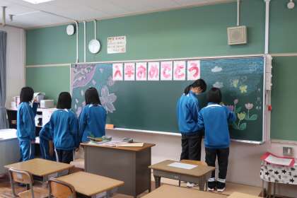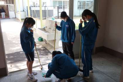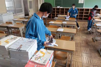 入学式・始業式の会場となる体育館のセッティング、1年生教室の飾りつけ、各クラスへの教科書の配布など、それぞれの分担でしっかりと活動していました。